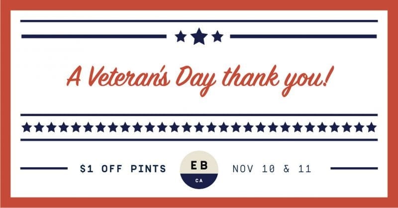 “We want to express our gratitude this Veteran’s Day by providing any (active or inactive) military members with $1 off each pint purchased. Just bring in a valid form of military identification. Cheers!”