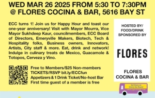 The Experience ECC is turning ONE! And going back to where they began - Flores Cocina & Bar @ Bay St Emeryville. Come raise a glass and help them celebrate this important Emeryville Commerce Connection milestone on Wed Mar 26, 5:30 - 7:30pm. Dive into amazing Mexican Appetizers, Totopos & Guacamole, plus Margaritas! Wine and Beer on Tap and More. Meet some new biz friends and visit with City officials, startups, business owners, innovators, creatives, plus our new ECC Board of Directors. Join the fun! And members, you can bring a friend for free for their first-time event! See you there. Members free. Non-members $25.