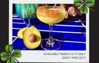 The Experience Lucky You at Flores! And the Top of the Morning to you! Start the celebration early on Friday, March 14th Ditch the green beer this St Patrick’s Day Weekend! Flores Cocina & Bar is serving up something even better - their Avocado Margarita! Have you ever had one? It’s smooth, creamy and perfectly balanced. Plus there are lots of excellent food choices. Grab your friends and join the crew at Flores and sip on a little luck – because everything’s better with tequila and avocado! This special ‘bebido’ is offered Fri-Mon, Mar 14 -17. Share some ‘Pequenos’. They have all kinds of veggie treats and much more, including: Totopos & Guacomole Sikil Pak – mayan pumpkin seed hummus, jicama sticks, lettuce cups Sopes de Frijol- crispy masa dumplings, black beans, lettuce, avocado, queso fresco, pickled jalapeño Queso Fundido – Oaxaca cheese, sauteed mushrooms, onion, salsa molcajete, tortillas