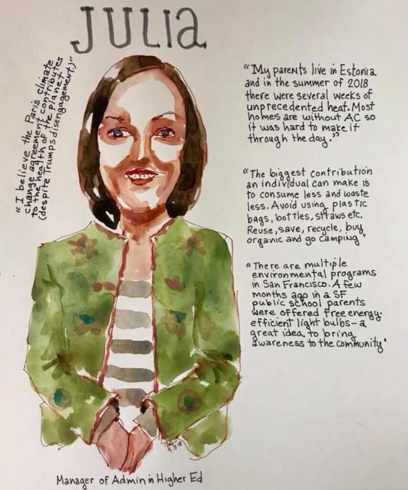 According to artist and SF Sketcher Vivian Aldridge, the sketchers explored how Climate Change was affecting people’s lives and through words and images conveyed their message for others. “Being part of a team that interviewed and sketched climate change activists was extremely rewarding because I knew viewers could learn from the sketches, discuss issues, and feel motivated to make changes in their own lives.”