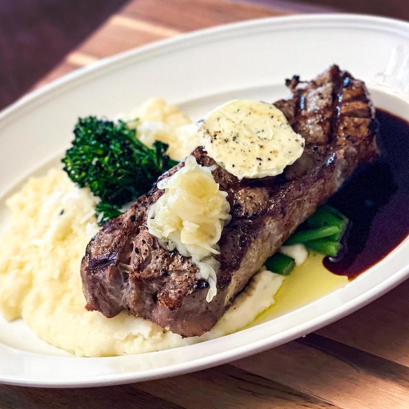 Menu categories start with Honorable Shares, Fresh from the Farm, Sandwiches & Tacos (fans rave about the blackened fish tacos), Stone Oven Pizzas. Larger Plates, Sides, Sweets, and Brunch Favorites. An old favorite in the Larger Plates section are the Bucket O’ Yard Birds with buttermilk fried chicken, macaroni salad, sausage biscuits, honey butter & hot sauce. The sexy steak must be the New York.