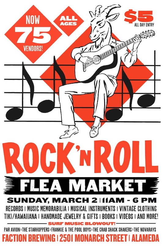 The Alameda Rock & Roll Flea Market returns to Faction Brewing on Sunday, March 2nd, 11am-6pm with an all-surf line-up, vendors, craft beer and fantastic food!
