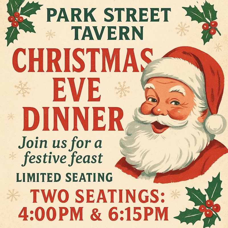 Join the crew at The Park Street Tavern for a special three-course holiday dinner crafted with love, tradition and the flavors of the season. There will be two seatings: 4pm and 6:15pm for you to enjoy one of these great dinners.