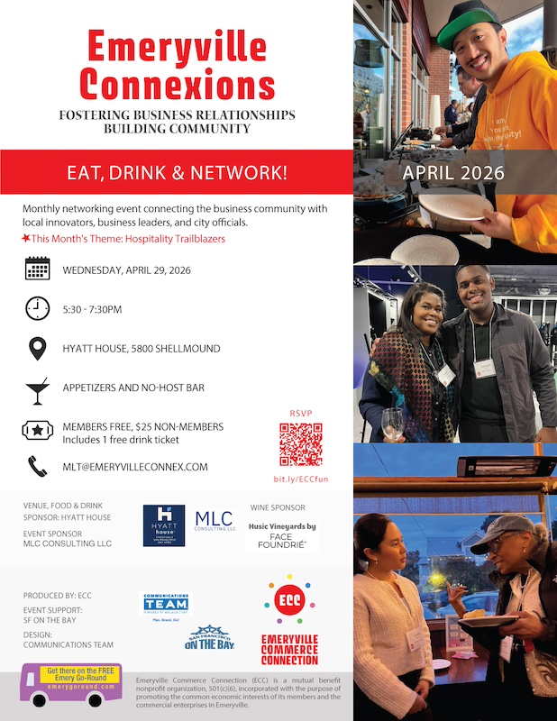 Come for the vibe. Stay for the connexions. Mingle with city officials innovators, entrepreneurs and the great hospitality industry that propels Emeryville.