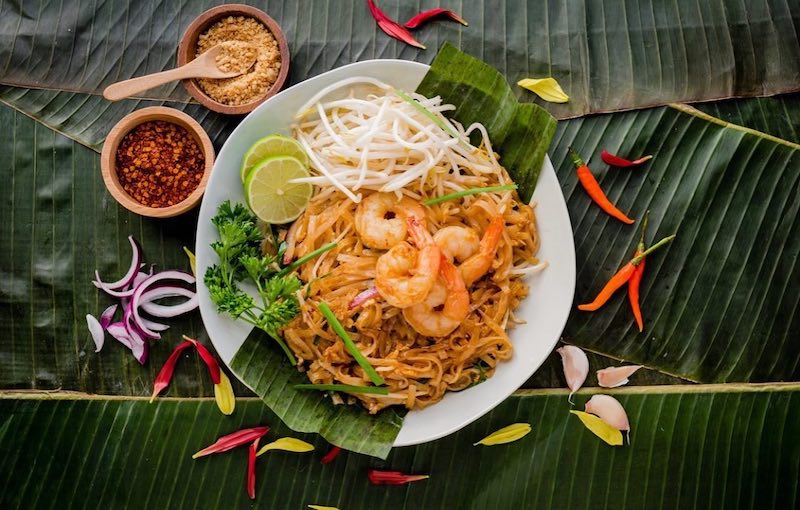 - Pad Thai – Rice noodles, egg, bean sprouts, red onions, green onions, garlic, and crushed peanuts.