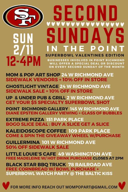 Shopping is definitely alive in Pt Richmond. Mom & Pop Art Shop is one business launching Second Sundays in the Point this Sunday, February 11 from 12-4pm. And yes, it happens to be Superbowl Sunday. It’s the Super Bowl LVIII/Valentine’s edition.