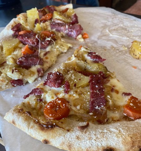 Chef Frank is serving all your favorite Wood-fired Pizzas! These are 12″ pizzas on their local honey and extra virgin olive oil dough. You can also order his Burger, Loft Salad and more.